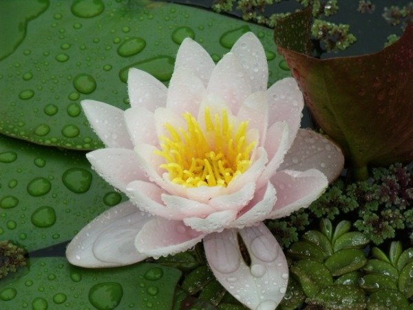 Nenufar mediano de flores rosa claro, flotan sobre el espejo de agua