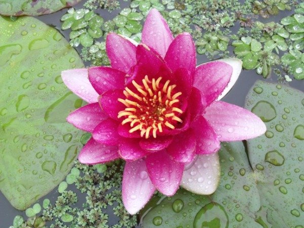 Nenufar mediano de bellas flores fucsia con blanco, muy floribundo